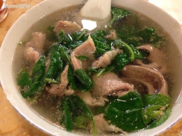 家猪筒骨先大火烫后慢火烫,作汤底,加冰糖、鸡汤,粉面汤用开水汤好,枸杞叶在汤里再煮沸,将粉面加在汤里就可以吃了,美味。