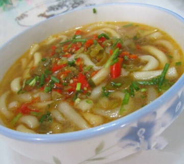 1. 酸菜切对后,与少许花椒在熟油中爆炒,待香味出来后加入纯净水熬制。熬开后放入土豆粉和香菇继续煮。