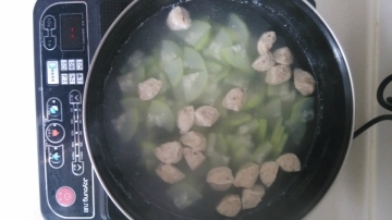 2.锅里加水烧开后,放个肉丸,等到肉丸涨起来,加入冬瓜煮熟,加适量盐,味精,少许花生油便可。