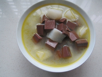 鸭血300克,山药300克,油、葱姜、盐、鸡精适量。