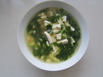 雪菜鲜脆,豆腐滑嫩。此汤含有蛋白质、钙及维生素,有补钙、生肌、润肠胃、增进食欲之功效。