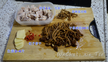 排骨1条,干茶树菇30g,生姜2-4片,杞子若干,圆肉若干,红枣2-3颗
