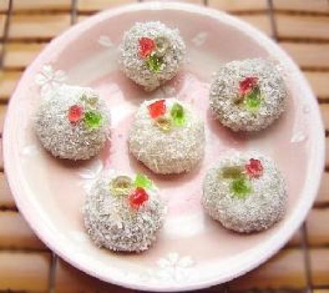 9.汤圆煮好后,捞起马上放进椰蓉里均匀沾上椰蓉,滚多几次可以粘得更细密。