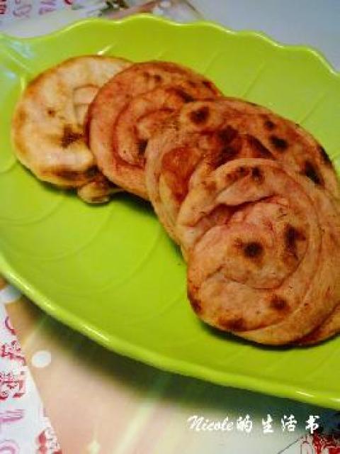 6.平底锅中刷一层油,将饼放入;小火烙3分钟,翻面再烙3分钟;如此反复至饼两面金黄,即可出锅。