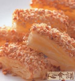3.蛋白和糖粉拌匀后,涂抹在作法2的酥皮面皮上面,再撒上杏仁角后,使用刀子将面皮切成长8公分、宽3公分的长方形状,最后放入烤箱中以180℃烤约20分钟。