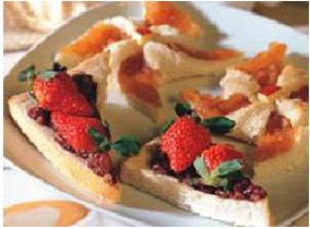 2.土司约烤1-2分钟,表皮呈现金黄色后,涂上奶油,并平铺上红豆泥及草莓,再将土司对切即可。