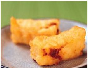 5.取一油炸锅,将沙拉油烧热至170度左右,将鲜奶油糕表面沾上脆浆,入锅炸至表面呈金黄色即可。