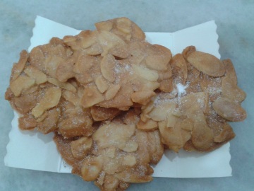 面粉80克,幼糖42克,蛋白120克,牛油60克,杏仁片260克。