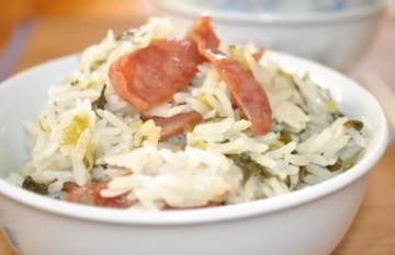 先将青菜切碎,起锅略施油,放入青菜略炒,放入调味料,将青菜里的水分炒出来,盛出放凉待用。(小贴士:青菜炒过以后出水,你可以把握好煮饭时放水的量。如果你用普通锅煮饭,最好将炒好青菜放凉,以免饭煮不熟!)腊肠切片(小贴士:家里如果有咸肉可切成片放一些),米淘净后将腊肠和炒好的青菜混和,放2cups水(有条件可以用鸡汤代替)。我用的是普通高压锅压阀以后10分钟即可。