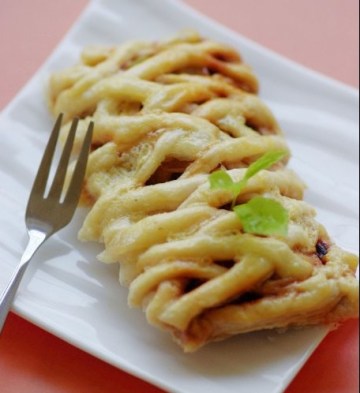 11. 剩余饼皮切成条,交叉覆盖到苹果馅上;