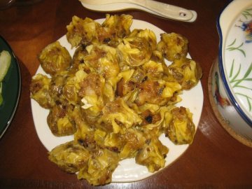 主料:糯米1/2杯,五香豆干2块,香菇2块,豌豆仁15粒,中薄云吞皮15张。盐,糖,淡色豉油,麻油。