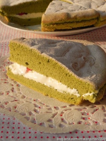 9.将完全冷却的蛋糕脱模,将蛋糕用刀子横切两刀(底部须稍微厚一些),将抹茶内馅涂抹在底部与中层蛋糕上,依序组合起来。最后将防潮糖粉均匀撒在表面后即完可。