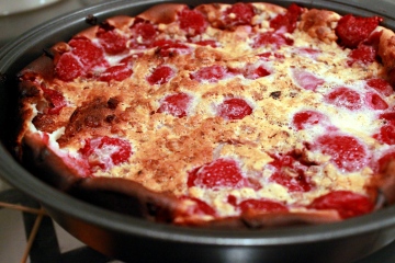 2、圆形烤盘中刷上一层薄薄的橄榄油,平铺上树莓(或草莓丁),面粉,鸡蛋,牛奶,白糖和香草精混合均匀,倒在烤盘中