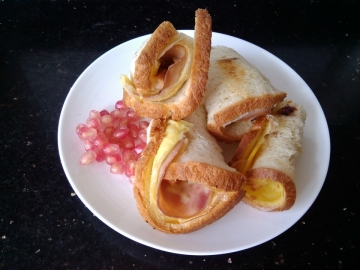 吐司4片,火腿4片,鸡蛋一个,马苏里拉芝士适量。