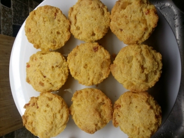 果脯(菠萝,木瓜,芒果干)200g,黄油90g,面粉 250g,玉米粉 250g,泡打粉 3g,盐 2g, 鸡蛋2个, 希腊酸奶 1/2cup,牛奶1/2 cup。