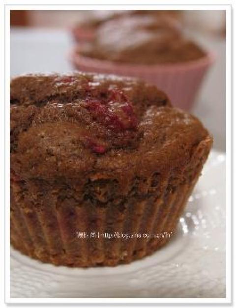 面糊应当是比较粘稠的糊状,所以豆浆的量可以适当调整以达到理想的稀稠度。不过这也不是非要很精准,偏稀的面糊烘烤时间长一些就可以了。 无脂全麦巧克力树莓玛芬 fat free whole wheat chocolate raspberry muffin 我做的全麦的巧克力树莓玛芬除了一点蜂蜜以外,没有放糖。因为树莓在烘烤以后会和其它水果加热以后一样有些酸味,加上黑巧克力粉的微微口味,口味比较重或是喜甜的朋友可以适当加2大勺红糖或是增加蜂蜜的量到2大勺。一次吃不完的玛芬可以密封放入冰箱的冷冻室里保存一周左右。