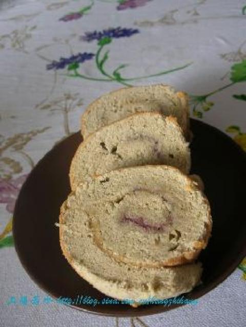 6.烤好出炉,放两分钟倒扣,揭掉油纸,待凉后抹上果酱卷起;