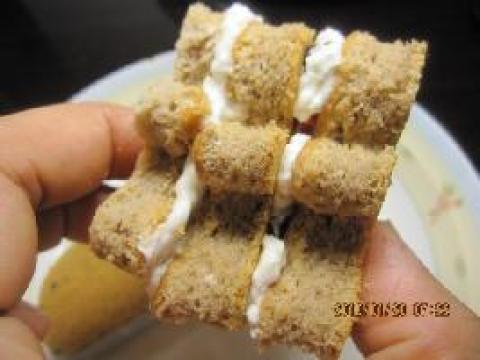 3、夹层抹上奶油,撒上葡萄干,把另一片铺上去。