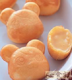 5.将仓鼠形烤模放在炉上以小火预热后,再用毛刷涂抹上一层薄薄沙拉油,将柠檬香鸡蛋糕面煳倒入烤模的凹槽内(约8分满),再放入适量奶油布丁馅,盖上盖子快速翻面,让模型整个沾黏上面煳,然后待烤至上色后(约1∼2分钟),用尖锥或竹签从接缝处挑起即可。