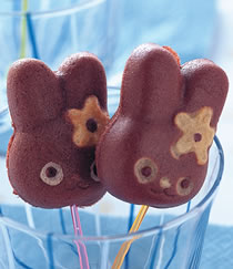 5.将兔形烤模放在炉上以小火预热后,再用毛刷涂抹上一层薄薄沙拉油,将巧克力鸡蛋糕面煳倒入烤模的凹槽内(约9分满),再盖上盖子快速翻面,让模型整个沾黏上面煳,然后待烤至上色后(约1∼2分钟),用尖锥或竹签从接缝处挑起即可。