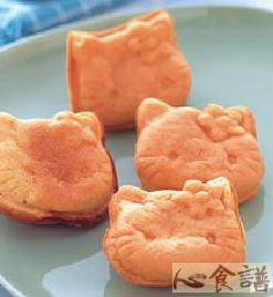 5.将猫咪形烤模放在炉上以小火预热后,再用毛刷涂抹上一层薄薄沙拉油,将胡萝卜面煳倒入烤模的凹槽内(约9分满),再盖上盖子快速翻面,让模型整个沾黏上面煳,然后待烤至上色后(约1∼2分钟),用尖锥或竹签从接缝处挑起即可。