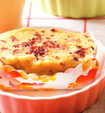 5.将作法4装入模型中,于表层撒上些许培根装饰,移入蒸笼,以中小火蒸约45分钟即可。