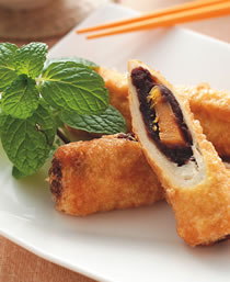 4.热油锅,将油温烧热至约120℃,放入作法3的土司卷油炸至表面呈金黄色,捞出沥干油脂即可。