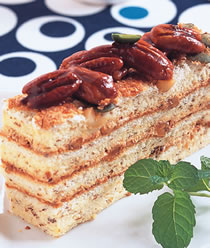 5.将蛋糕体切成4等份,在第一层抹上咖啡奶油霜,并撒上烤熟的碎核桃后,以此法一层层重复叠层组合完成后,再将其切成长12公分,宽3公分之长方形;最后于蛋糕表面装饰焦糖胡桃与开心果即可。