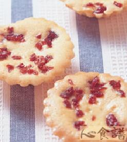 6.作法5面煳装入作法1模型中,表面撒上作法3蔓越莓,入炉烤焙,烤焙温度上火200℃,下火170℃,烤至表面呈金黄色且有弹性即可。
