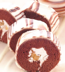 5.组合:将作法2烤好的的巧克力蛋糕体切成2片,每片为12.5cm×30cm,再均匀地抹上作法3奶油霜后,撒上已烤熟的碎核桃,将蛋糕体捲起呈长条状,长度30cm。