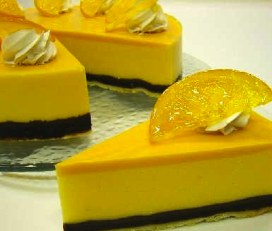 3. 起司蛋糕:吉利丁加水35 ml略拌、静置数分钟。鲜奶油打发至稠糊状(切勿打挺,只要变成浓糊状,能够缓慢流动的状态即可)。cream cheese切小块,用微波炉加热软化成糊状,加入糖、优格、柠檬汁拌匀。再用微波炉加热吉利丁水使成澄清溶液,也倒入一起拌匀,最后拌入打发的鲜奶油,拌匀之后注入慕斯圈中,放进冰箱冷藏隔夜。