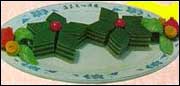 3、用平底蒸盘一个,抹上生油,倒入一层白色米浆,(厚约0.6厘米)上笼蒸5分钟至熟取出,再加入一层绿色米浆,再蒸5分钟,如此间隔反复蒸至第8层为止。