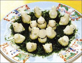 3.将豆沙馅包入,分别做成小鸡形和熊猫形,用黑芝麻点上眼睛,即成半成品。