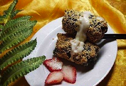 2、拍上吉士粉,然后用紫菜包裹成卷,沾上蛋清,粘上白芝麻,下油锅炸至焦黄。炸好就可以吃了!