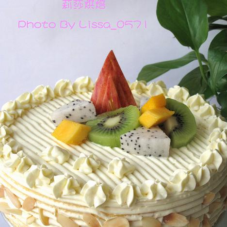 装饰:凉后分切成两片,中层抹上打发的奶油,撒上水果丁,盖上另一蛋糕片,周围均匀抹上奶油,用三角花齿刮片刮出条纹,放上水果,周边沾上烤香的杏仁片。