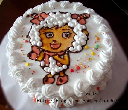 昨晚做了巧克力蛋糕体,今天妈妈帮我弄了个盒底,开工啦!打发了鲜奶油,蛋糕体分为二片,中间涂上鲜奶油,外表面也涂满,我的技术实在太差,二十分钟涂得也不是太好,行,就这样了。拿出事先准备好的美洋洋图案,铺在蛋糕体上,描出外轮廓,取下,坏了,脸部都模糊了,让妈妈帮忙把纸冲一下,结果什么线条都没了,脑袋立马大了,打开电脑,找,没办法,在电脑桌前用巧克力开画,宝贝儿子一个劲捣乱,急死我啦!好在画出来还说得过去。填上qq糖溶液,挤上花,大功告成!