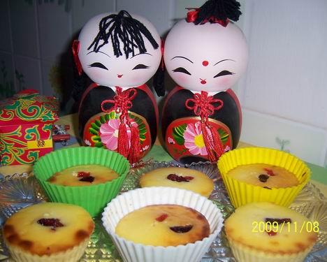 方子:6寸(硅胶六连模)---(我用的是硅胶玛芬蛋糕模),奶油奶酪250克(我用230克),糖55克,柠檬汁1小匙(我省略了),鸡蛋2个,鲜奶油60克,黄油20克,蔓越莓20克