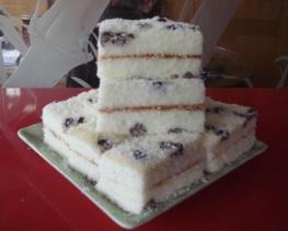 7.取其中一等份涂抹上桔子果酱后,覆盖上另一等份的蛋糕体,再以刀子切出数个长方形的块状即可。