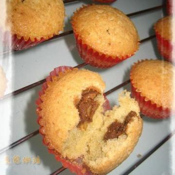 6.将面糊装入裱花袋,挤1/3分量于小纸杯内,内馅装裱花袋,挤入面糊内,再将面糊挤入至8分满