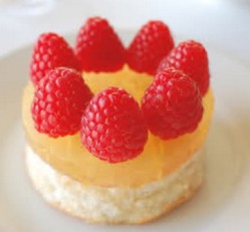 3、取出果冻蛋糕,倒扣在盘子上,去除保鲜膜,最上面可以点缀些raspberry或其它水果。你也可以象我这样,用小号的dessert ring切出几块迷你果冻蛋糕。