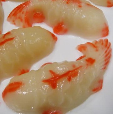 8、蒸好的年糕鲤鱼要晾凉再脱模----据说热的脱模可以造成年糕鲤鱼变形。虽然模子刷过油,但是脱模还不是一件很容易的事。另外,放年糕鲤鱼的盘子,最好事先先刷一层薄薄的油,这样年糕鲤鱼不会和盘子粘的很紧。