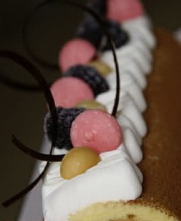 用刷子把咖啡酒浆刷在蛋糕体上,抹上提拉米苏糊卷起.放入冰箱冷冻2小时(冷冻后的蛋糕好切).撒上可可粉,然后最后用巧克力,冷冻的黑莓和夏威夷果装饰.