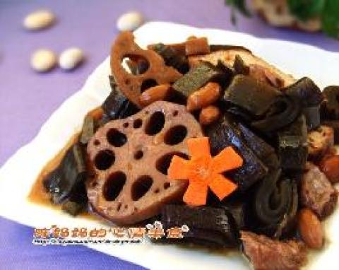 主料:大骨棒,海带,五花肉,海鱼(黄花鱼,鲅鱼等),莲藕,白菜,豆腐(老豆腐),花生等,以上材料均需1.5斤左右。也可根据各人喜好,适当填加其它材料。酱油,醋各一瓶,盐,糖,酒适量。