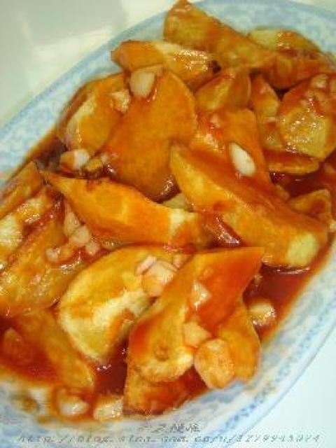 2.另起油锅:放入蒜蓉爆香,沙司2勺,少许糖熬滚,再倒如炸好的土豆,拌匀即可。