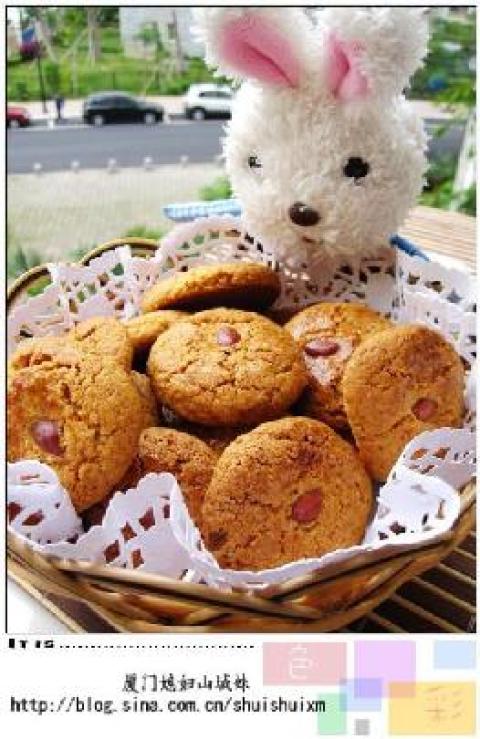 鸡蛋1个,普通面粉一杯,烤熟的核桃仁花生仁一小把去皮切碎,黄油90,白砂糖1/8杯,红糖1/8杯,苏打粉1/3小匙