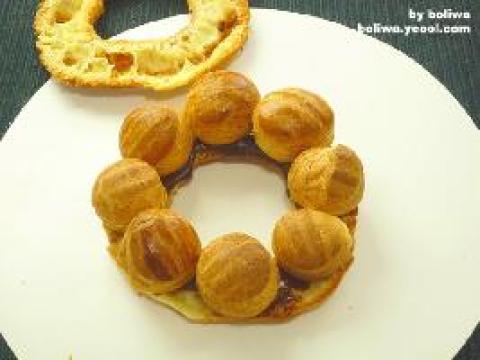 10.泡芙圈1.将泡芙面团挤成环状烘培2.烤完后冷却,切成2片,然后再一片里面涂上焦糖奶油,再摆上泡芙球,再盖上另一片即可