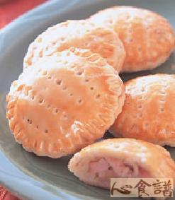 1.取一桿折松弛好的油酥皮,桿成0.8∼1公分左右的厚度,再以圆形菊花模压出圆形面皮,取一片面皮中间放上燻鸡馅,于面皮边缘涂上蛋汁,再取另一片面皮覆盖在上面,略微压紧,表面刷上蛋汁,并以叉子戳上小洞,置于烤盘上。
