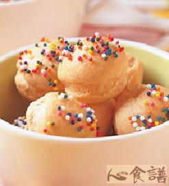 泡芙面煳:187公克,盐3公克,沙拉油112公克,高筋面粉150公克,全蛋270公克,装饰:适量,彩色糖粒适量