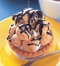 2.在泡芙内填装法式布丁馅,塔皮摆上数颗小泡芙,叠成塔状,最后以融化的苦甜巧克力划线装饰即可。