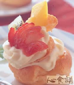 9.将放凉的泡芙,以横刀的方式对切,中间填上克宁姆馅,最后再放上作法8的各式水果即可。
